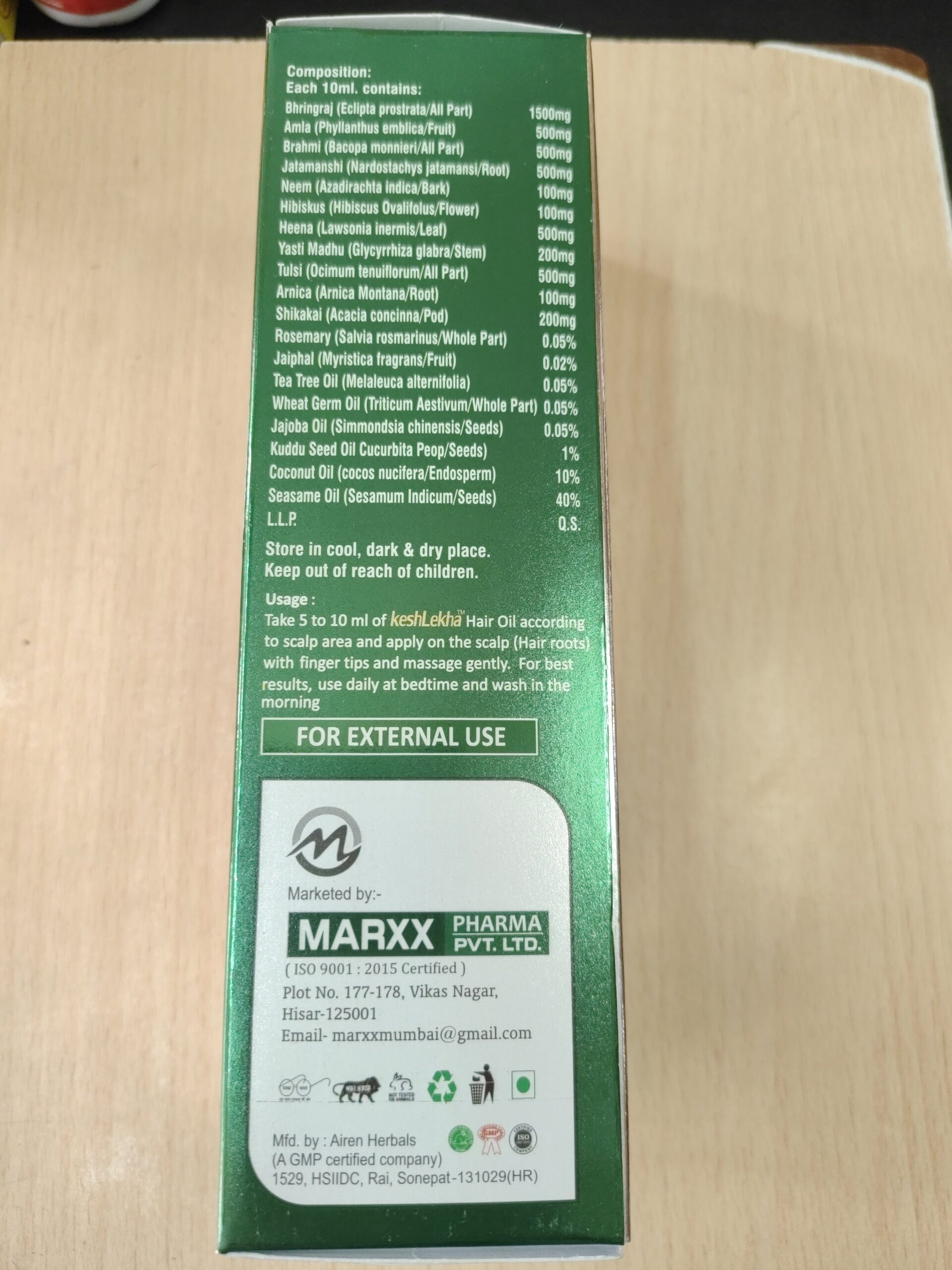 Bhringraj, Amla, Brahmi, Neem, Coconut Oil, Sesame Oil, Hibiscus, heena, and more authentic Ayurvedic herbs.