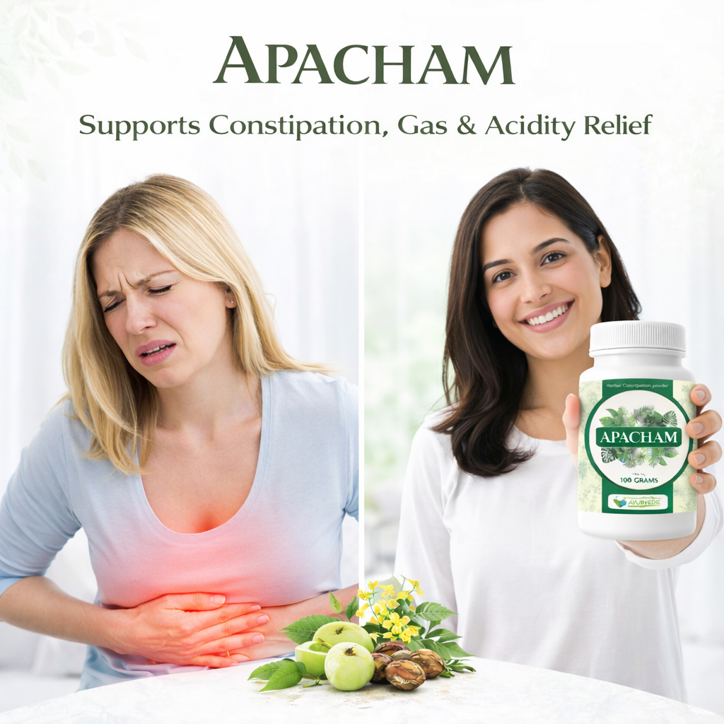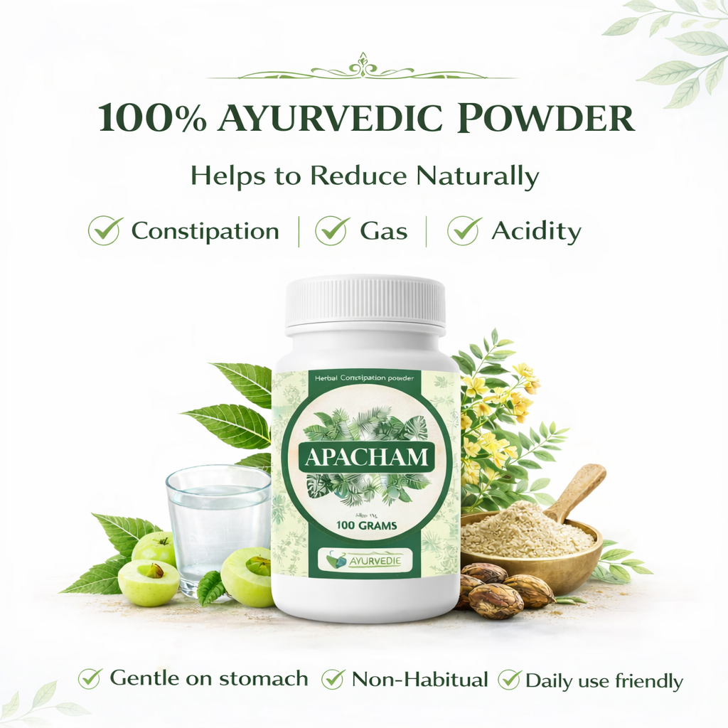 Apacham Ayurvedic Constipation Powder is a traditional Ayurvedic formulation designed to support healthy digestion and provide natural relief from constipation, gas, acidity, bloating, and sluggish bowel movement. Prepared using time-tested Ayurvedic herbs, Apacham works by supporting the digestive system rather than forcing artificial bowel movement, making it suitable for regular and long-term use when taken as directed.