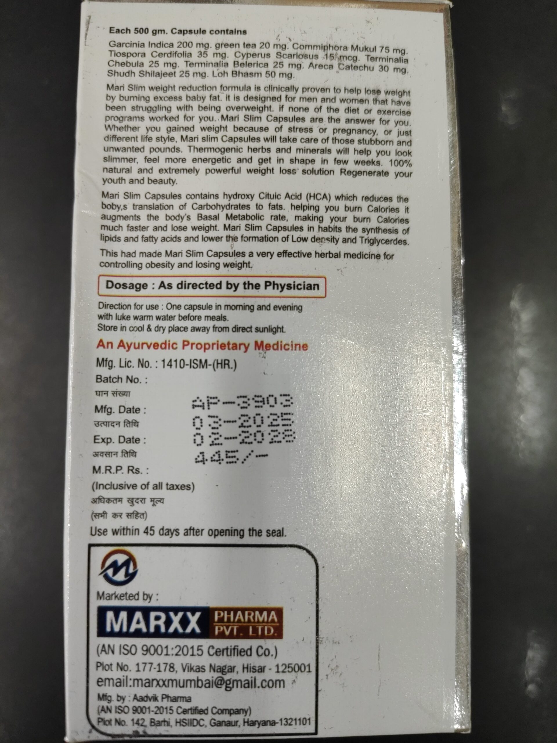 Mari Slim is a strong Ayurvedic fat burner that reduces body fat percentage, supports inch loss and boosts natural thermogenesis (heat production for calorie burning). It helps improve digestion, remove toxins and enhance fat metabolism. Useful for people struggling with slow weight loss or stagnant fat.